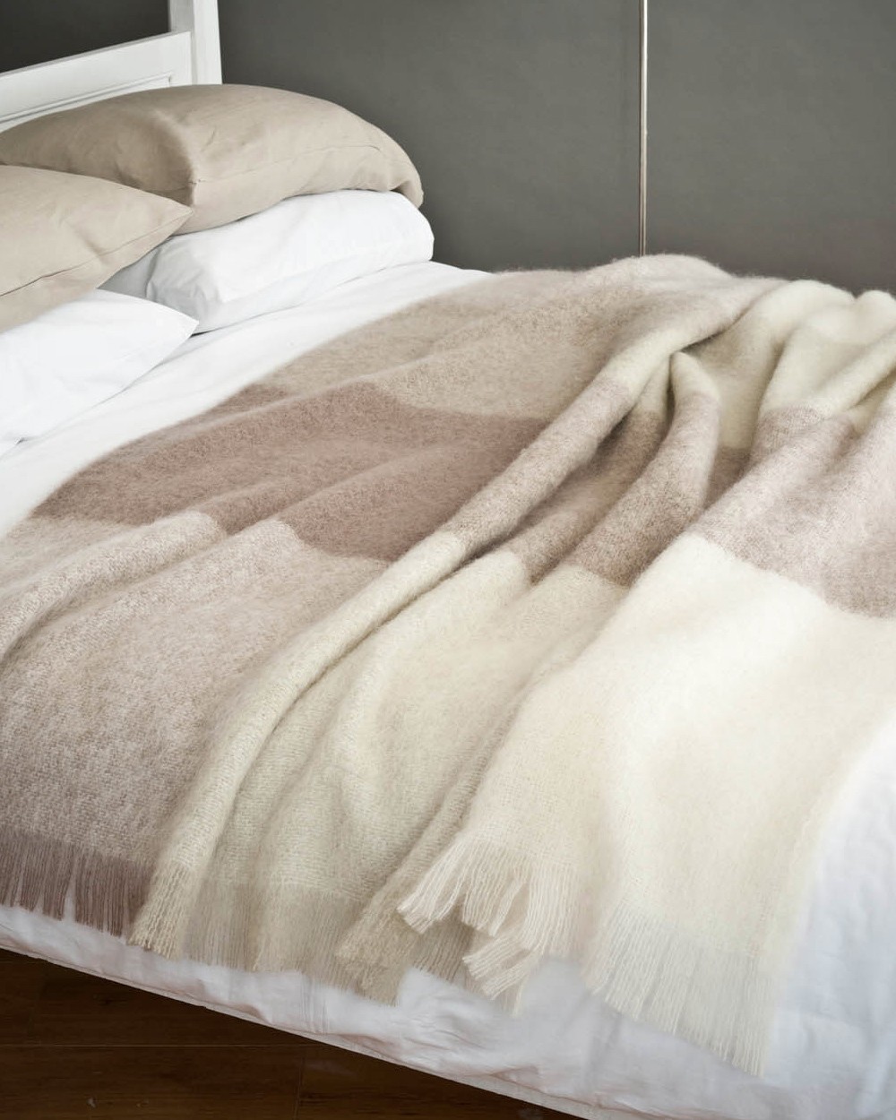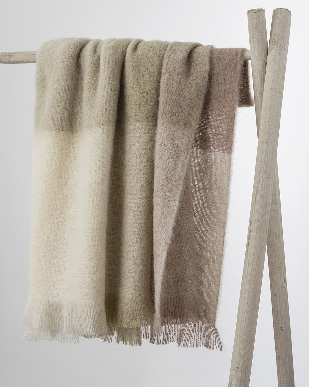 This Alpen mohair throw features tonal hues of beige and cream which compliment almost any interior. The luxurious mohair is soft and cosy, ideal for a sofa or bedroom. Measures 56×72 inches. Made of 70% mohair and 30% Pure Wool. Made in Ireland.