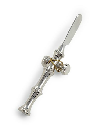 This silver plated cheese knife is handcrafted with bamboo detail. Designed by Thomas Fuchs. Hand Wipe. Made in India.
