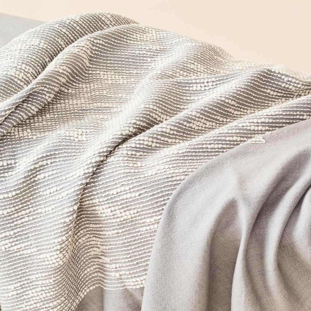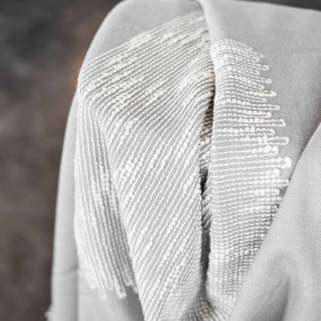 FLO Grey throw / blanket luxuriously combines heritage value & high quality craftsmanship. A perfect gift or personal purchase, FLO is a timeless classic throw / blanket that will complement your personal or living spaces and also support artisan communities ethically. This plush textile’s design is a modern take on combining shape and fine detailing of hand embroidery handcrafted meticulously on a handloom textile. Large square in shape, each piece is 100% handmade making it a unique sustainable throw which is both classic and minimal modern in its appeal. Hand embroidered pattern is textured on one side and subtle on the reverse side as well , making this throw or blanket reversible to arrange and use.
