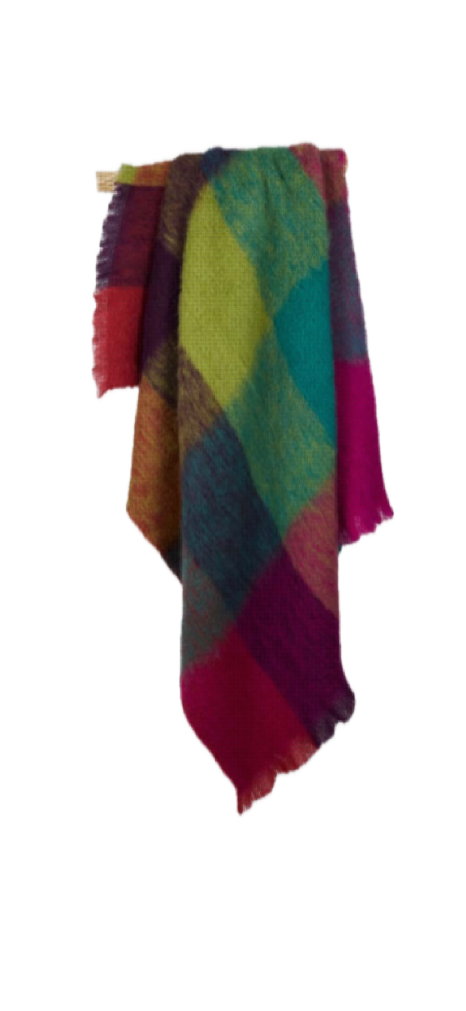 Beautiful shades of green, fuchsia and blue mohair throw from Ezcaray Mantas is made of 73% mohair and 27% wool. measures 51×79 inches. Made in Spain. Dry clean only.