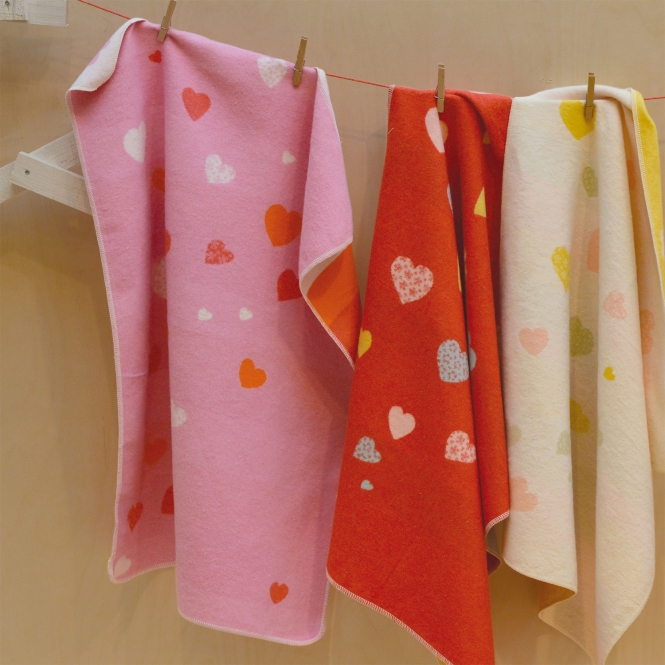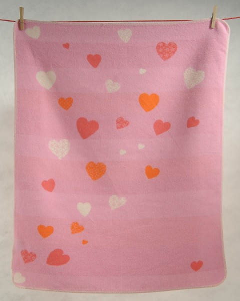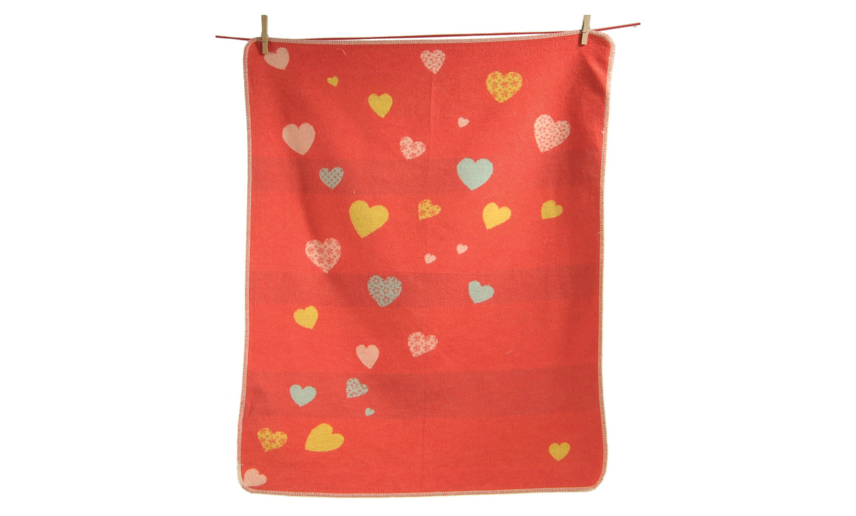This beautiful heart blanket is made by David Fussenegger. It has stitched edge and measures 28×36 inches. Made of 95% Cotton 5% Rayon. Available in three colors, pink, red and off white. Made in Austria.