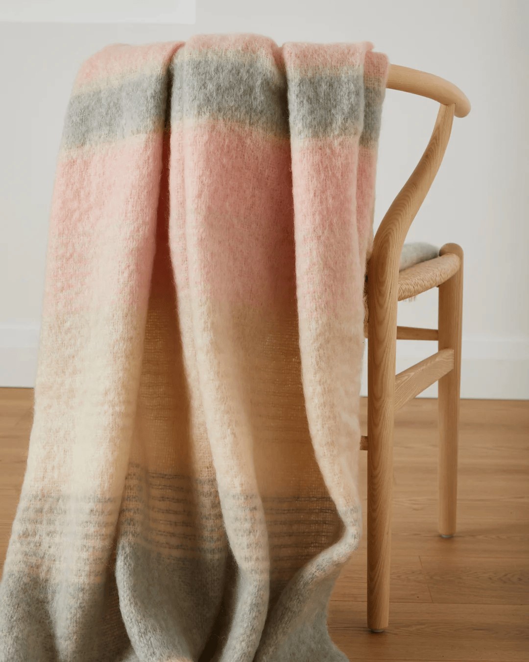 Part of the New Neutrals collection, the Heather Mohair Throw is a fluffier alternative to more traditional lambswool designs. Each one is expertly woven at our County Mayo mill using a comforting blend of wool and pure mohair. This soothing style is crafted using shades of grey, bone and pink yarn and finished with a traditional raw edge fringe.