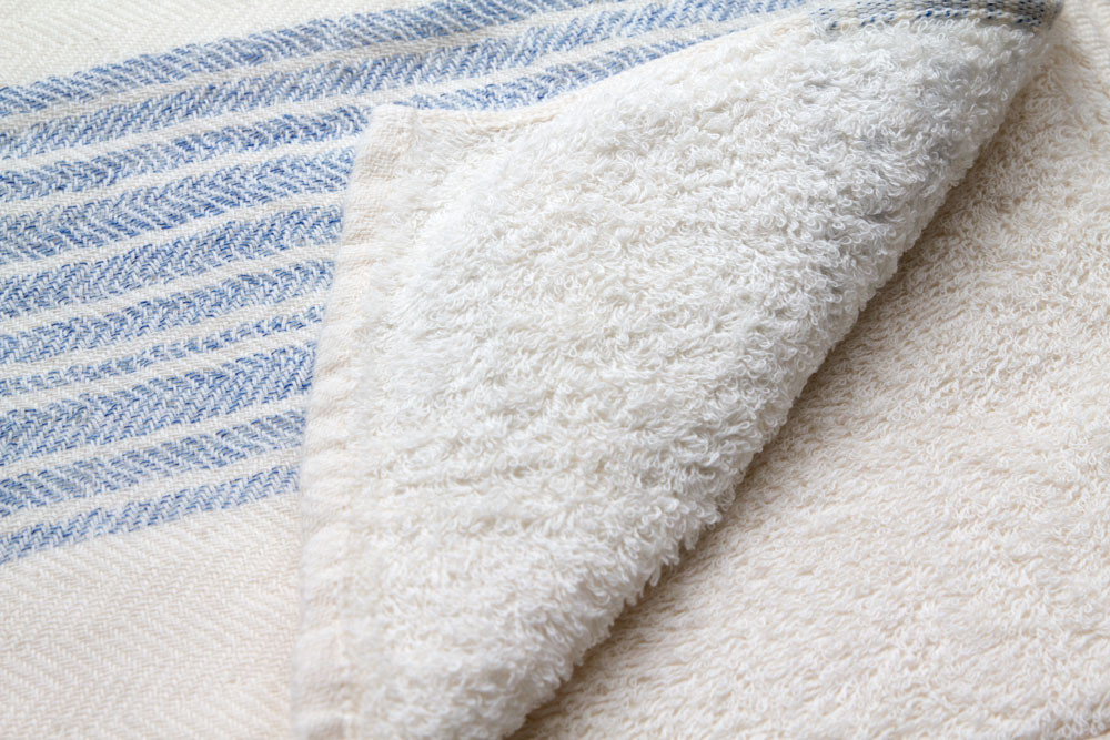 The Flax Line Organics series have a delicate chevron pattern with a striped border on one end. Each towel has two sides: an ultra-soft cotton weave and a looped cotton terrycloth pile. The exceptional design and care in processing the cotton make the Flax Line towels highly absorbent, lightweight, fast-drying and environmentally friendly. Made in Imabari, Japan by Morihata.100% organic cotton.
