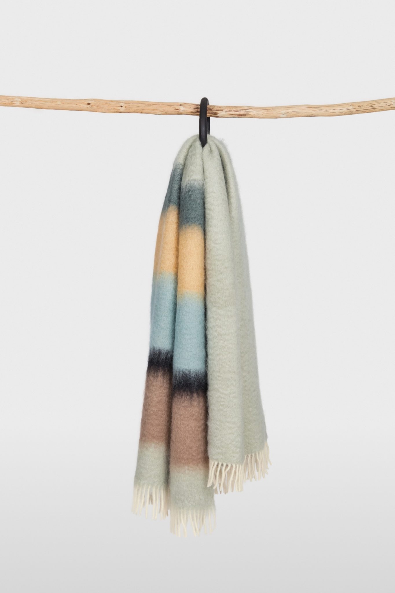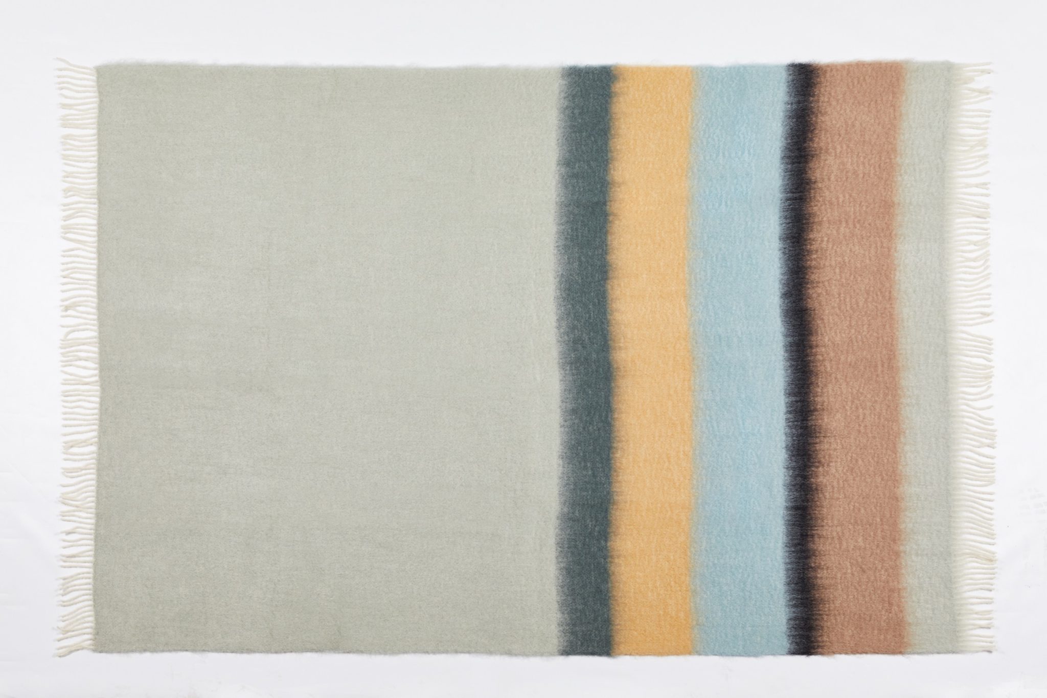 Light blue blanket base and vertical stripes in brown, yellow, sky blue and gray.