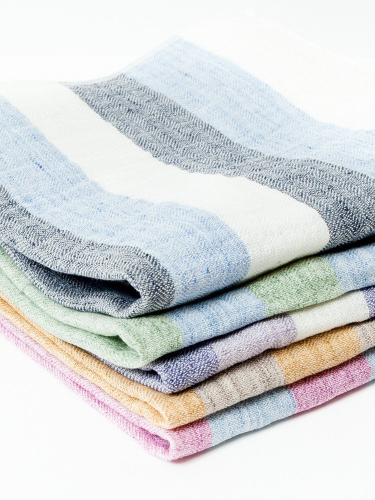 Made of 50% linen and 50% cotton, the striped Kitchen Towel is a breathable and absorbent towel that’s perfect for drying plates and everyday use. Available in five cheerful colorways, its charming stripes bring a pop of color to any kitchen counter. This sunny style folds down flat for storage and features a small tab for easy hanging. Machine wash with cold water and mild detergent. No bleach or fabric softeners. Hang or tumble dry low. Made by Morihata in Imabari Japan.