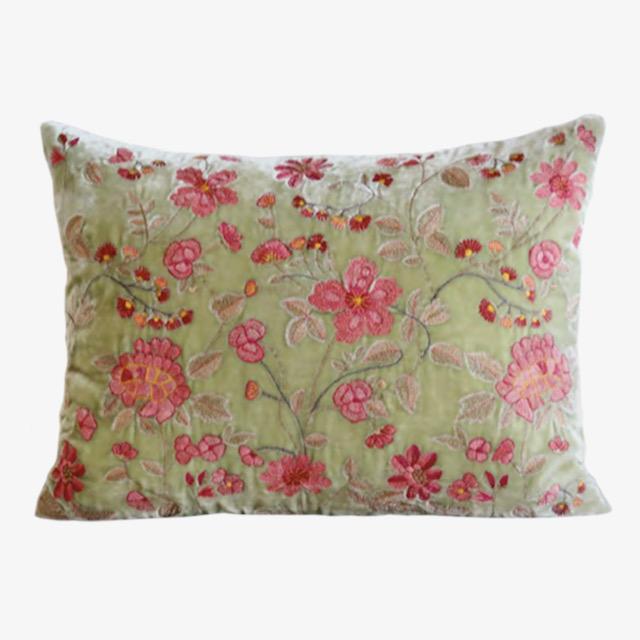 Anke Drechsel’s silk velvet pillows stand out due to their lush colors. Her master craftsmen use both fine hand embroidery and small hand-guided machines to achieve her intricate and visually stunning designs. Perfect for layering on Sofas or bed. Insert not included. Measures 12×20 inches. Made of 100% silk velvet.