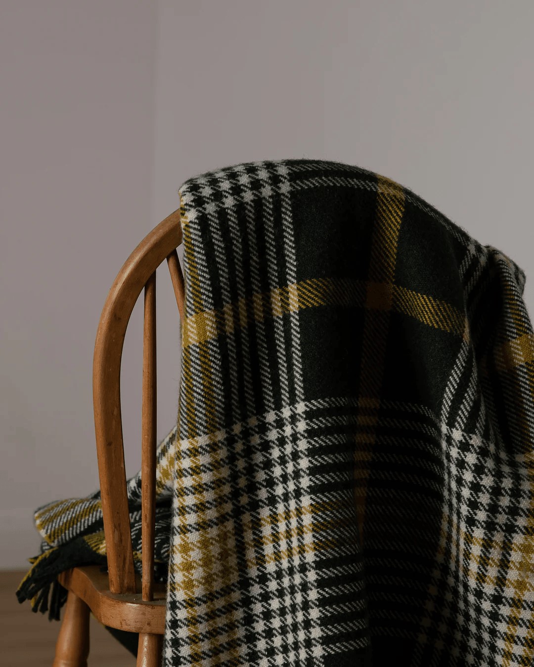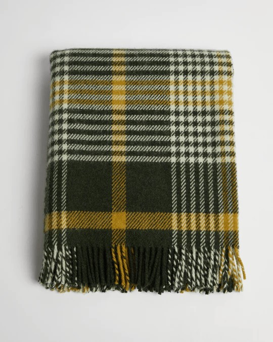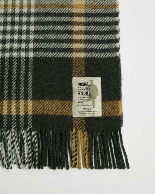 Woven in our traditional check, using a vintage 4-ply yarn in olive, gold and white, this warm, durable throw features a bespoke Michael Collins House label and is finished with a traditional roll fringe.