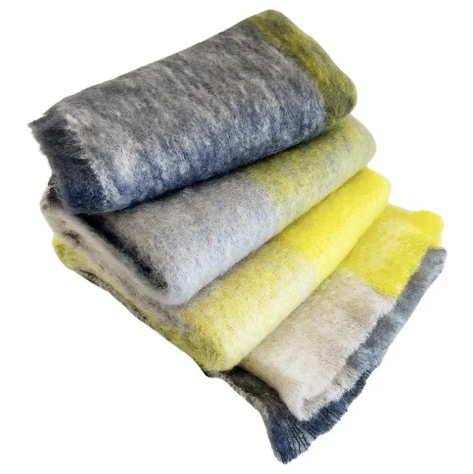Beautiful shades of gray, yellow and cream color mohair throw from Mantas Ezcaray is made of 73% mohair and 27% wool. Measures 51×79 inches. Made in Spain. Dry clean only.