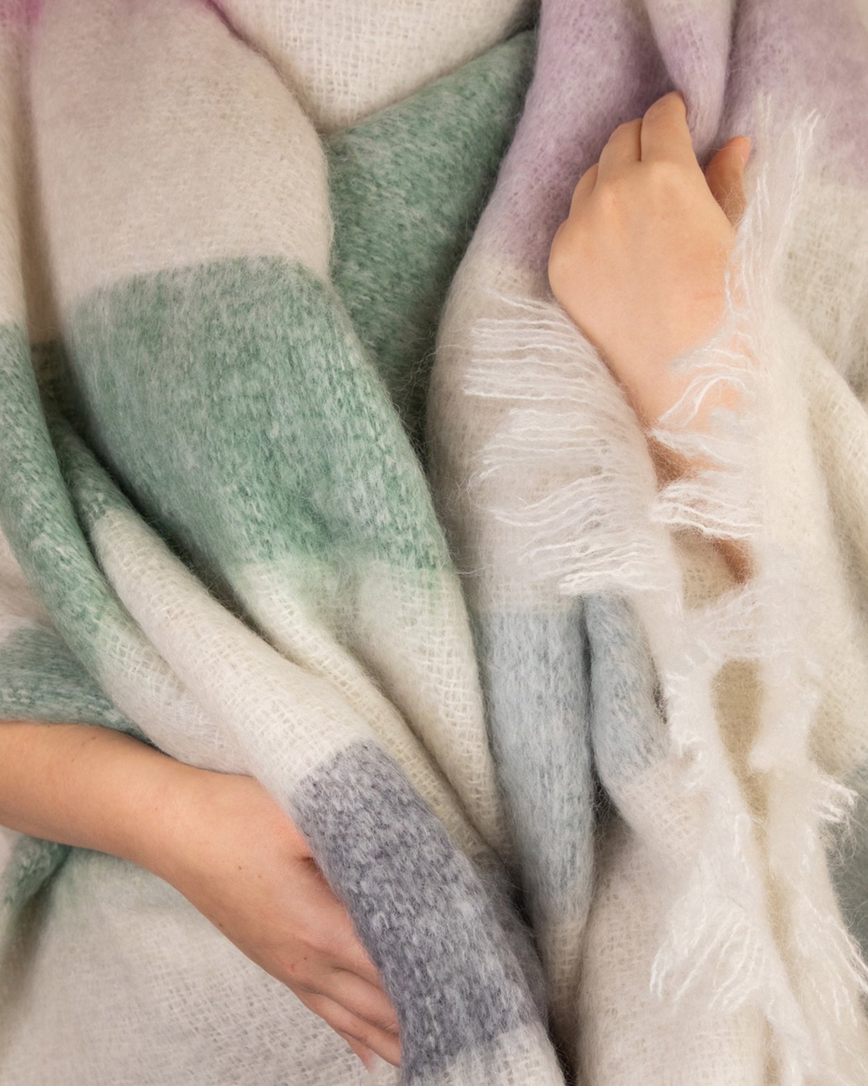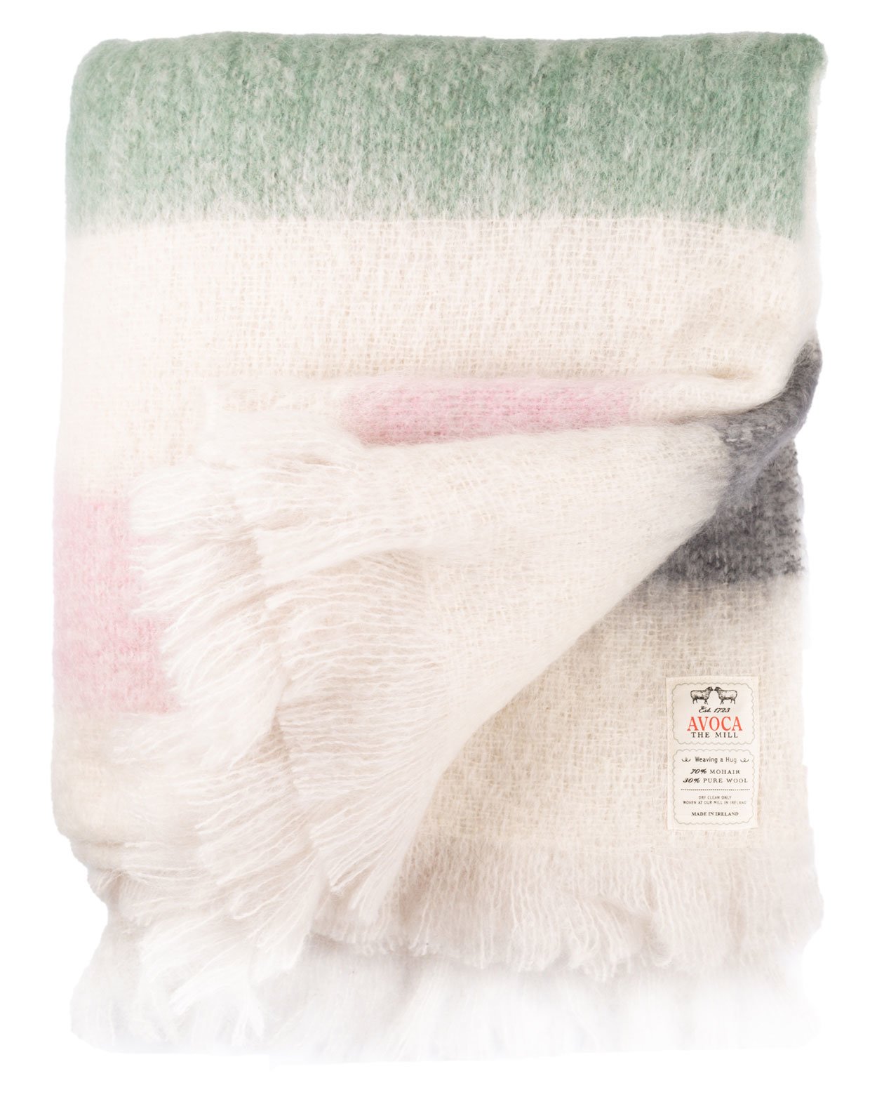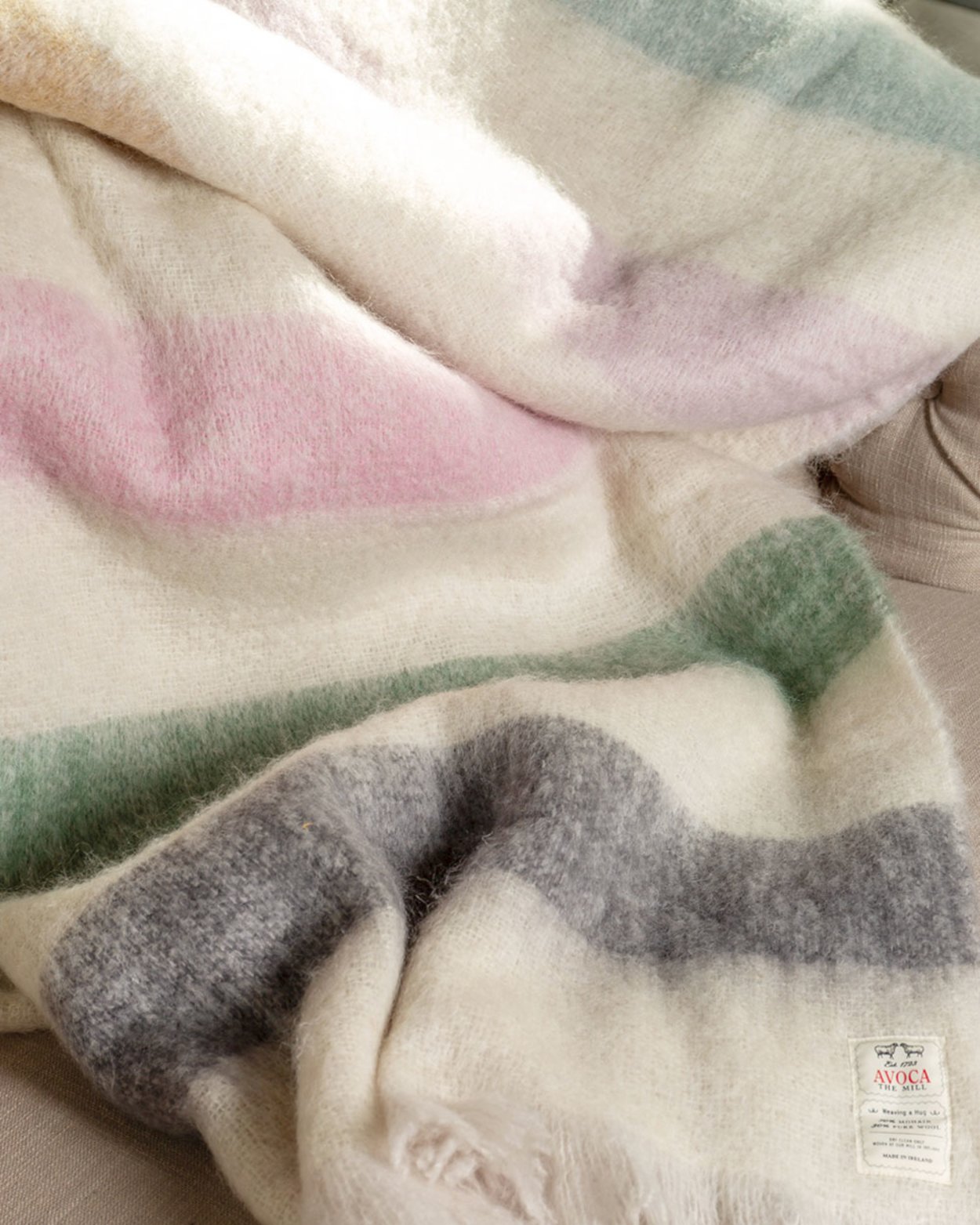 Colorful yet subtle, our Pastel Stripe mohair throw injects a rainbow spectrum of delicate hues wherever it is placed within your home. Created from concept to craft by our wonderful Avoca team – we adore the soft blue, lavender, peach, pink, green and grey stripes adorning this neutral cream blanket. The lofty and luxurious blend of mohair and pure new wool yarns make this the perfect choice to uplift a chair, sofa or bed and to cozy up with on chilly nights.