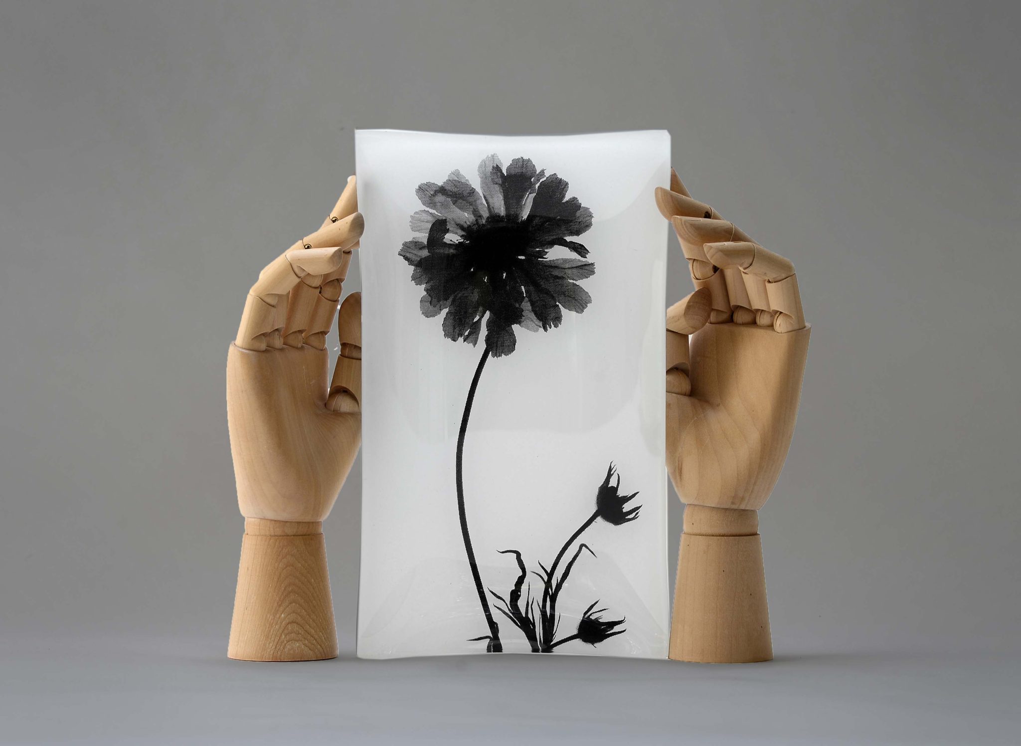 Molly McCall has combined two antiquarian techniques together in her latest series of glass plates: Photogram images are screened on to glass plates using crushed glass glazes. These glass layers are then fused together in a two-part glazing and firing process and then formed by hand in to plates. The result is an ephemeral floating image translucent and light as air. The fusion creates a smooth surface, which is both waterproof and dishwasher safe. Care: Do not remove the MMC label with a sharp object, you may scratch the plate. The label is a non-adhesive material and will come off easily with just a fingernail. Dishwasher safe, use mild detergent on warm gentle cycle. Never place glass in a freezer. These plates are not microwave safe.