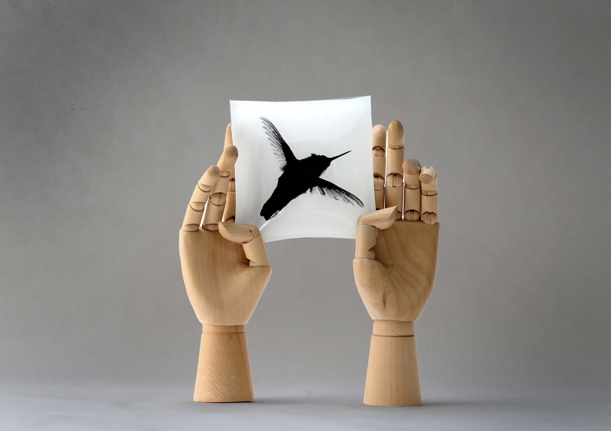 Molly McCall has combined two antiquarian techniques together in her latest series of glass plates: Photogram images are screened on to glass plates using crushed glass glazes. These glass layers are then fused together in a two-part glazing and firing process and then formed by hand in to plates. The result is an ephemeral floating image translucent and light as air. The fusion creates a smooth surface, which is both waterproof and dishwasher safe. Care: Do not remove the MMC label with a sharp object, you may scratch the plate. The label is a non-adhesive material and will come off easily with just a fingernail. Dishwasher safe, use mild detergent on warm gentle cycle. Never place glass in a freezer. These plates are not microwave safe.