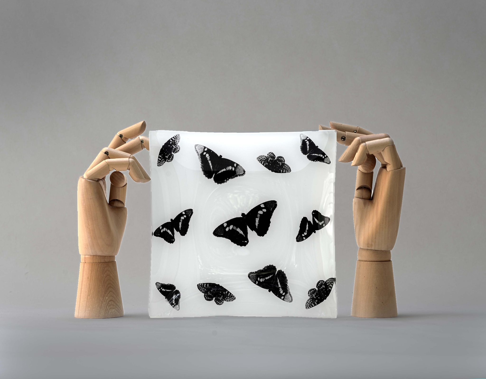 Molly McCall has combined two antiquarian techniques together in her latest series of glass plates: Photogram images are screened on to glass plates using crushed glass glazes. These glass layers are then fused together in a two-part glazing and firing process and then formed by hand in to plates. The result is an ephemeral floating image translucent and light as air. The fusion creates a smooth surface, which is both waterproof and dishwasher safe. Care: Do not remove the MMC label with a sharp object, you may scratch the plate. The label is a non-adhesive material and will come off easily with just a fingernail. Dishwasher safe, use mild detergent on warm gentle cycle. Never place glass in a freezer. These plates are not microwave safe.