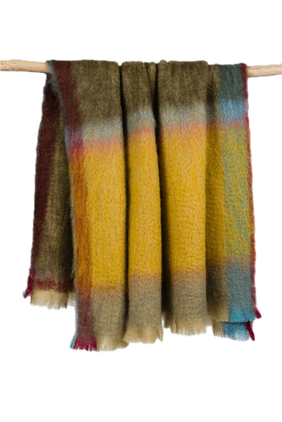 Rozco mohair throw in the shades of olive green, mustard yellow and blue. Made of 73% mohair and 27% wool. Measures 51×79 inches. Dry clean only. Made in Spain.