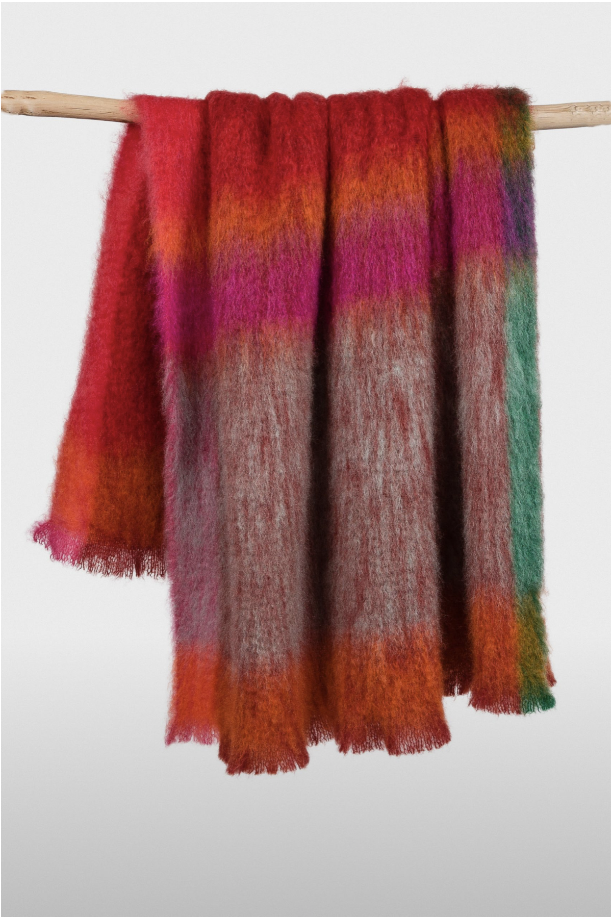 Rozco blanket with a combination of red, orange, fuchsia pink and green tones. Made of 73% Mohair and 27% Wool. Measures 51×79 inches. Handmade in Spain.
