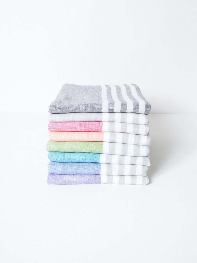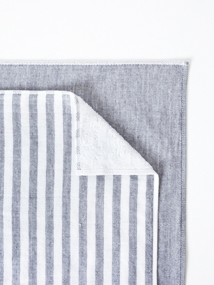The Square Towel features a smooth, tightly woven front and a looped terry pile back stitched together. The meticulous design makes these lightweight towels highly absorbent, fast-drying and soft to the touch. This collection pairs clean stripes with the boldness of a solid color block, and features a looped tab accent for easy hanging in the kitchen or bath. Made by Morihata in Imabari Japan.