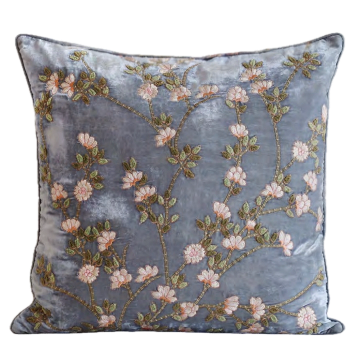 Anke Drechsel’s silk velvet pillows stand out due to their lush colors. Her master craftsmen use both fine hand embroidery and small hand-guided machines to achieve her intricate and visually stunning designs. Perfect for layering on Sofas or bed. Insert not included. Measures 20×20 inches. Made of 100% silk velvet.